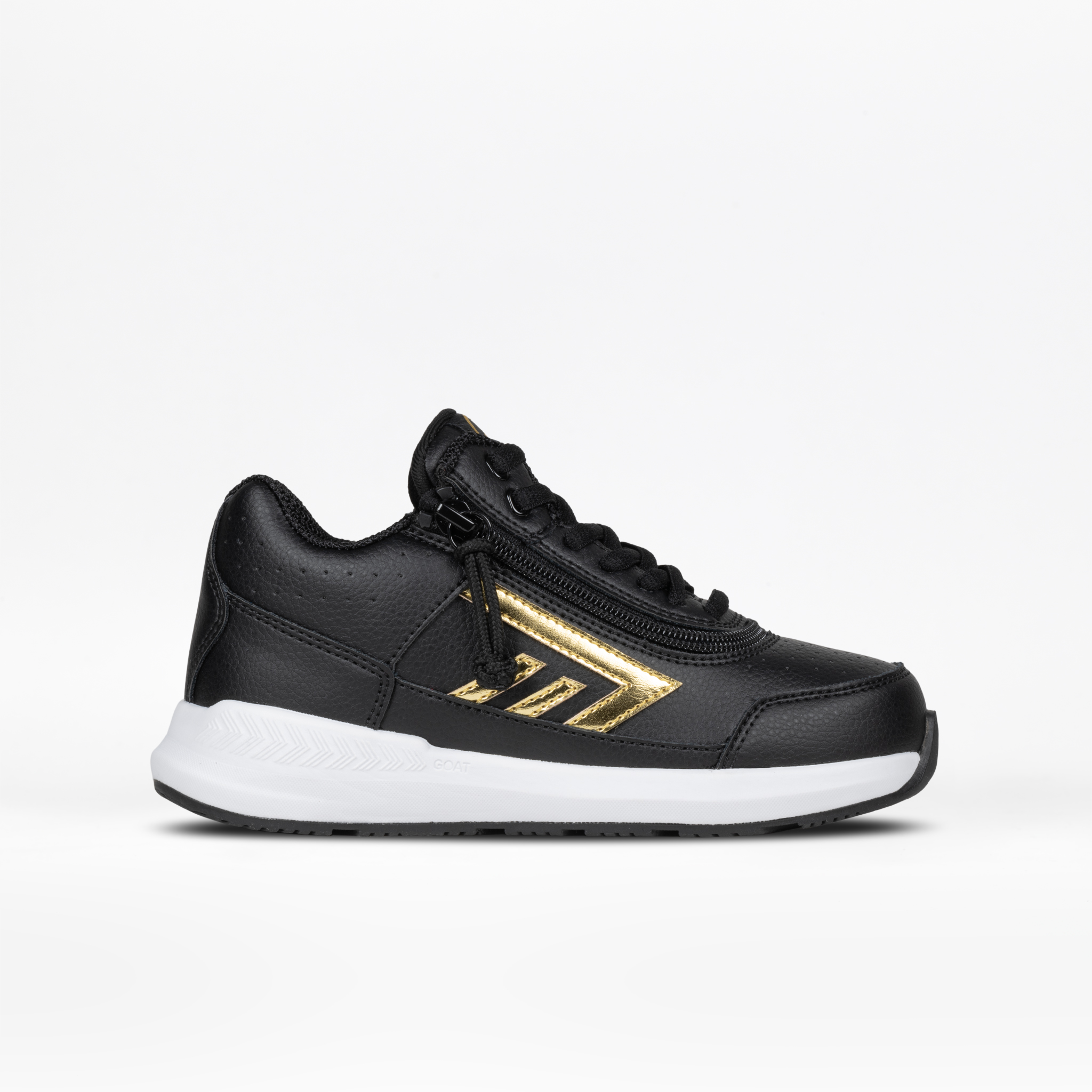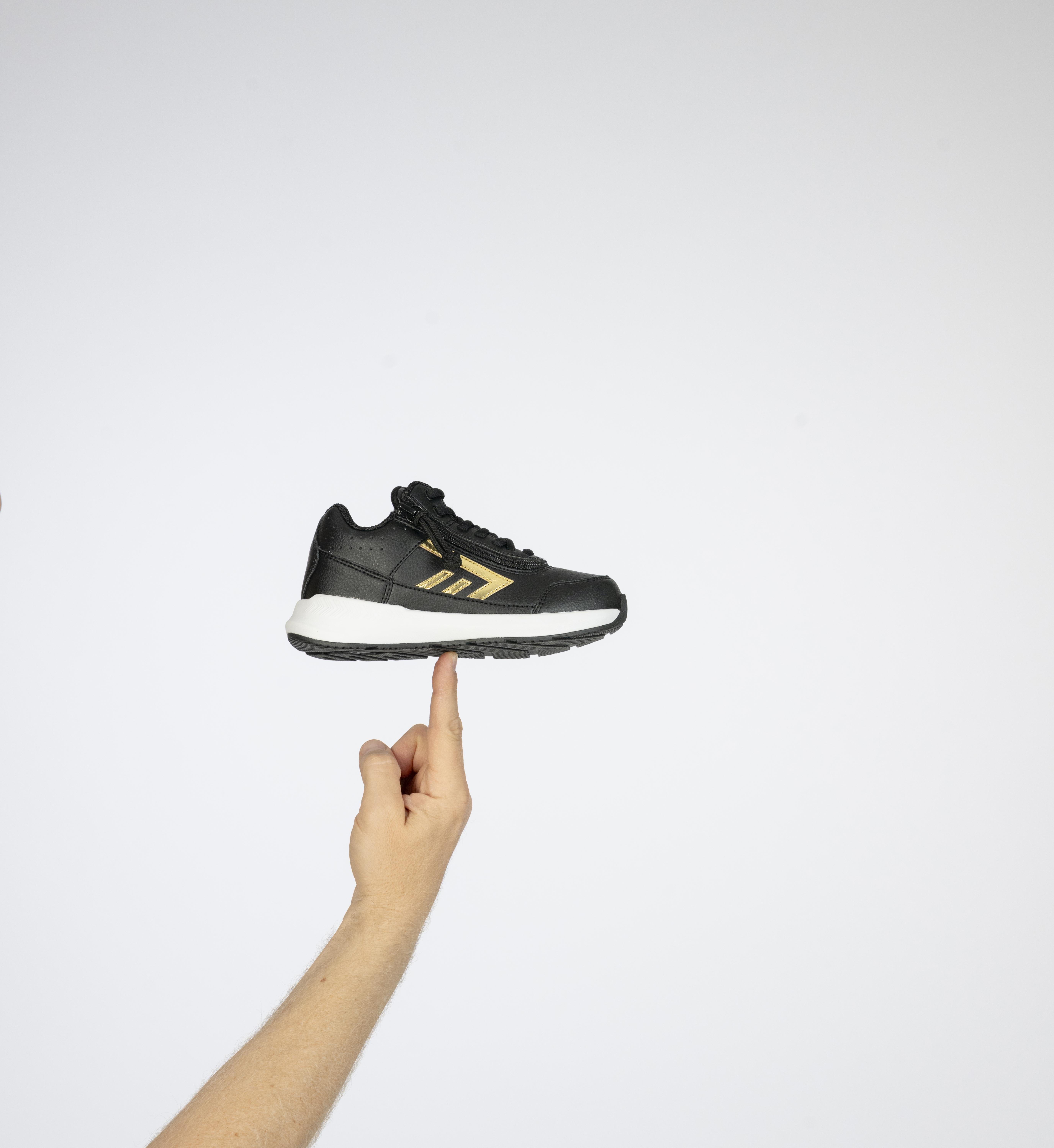 De BILLY Goat Hoop in Black/Gold combineert een stijlvolle uitstraling met praktische toegankelijkheid. Het glanzende zwarte bovenwerk met goudaccenten straalt klasse uit, terwijl de korte BILLY rits het aan- en uittrekken eenvoudig maakt, ook met AFO’s of orthesen. De zachte binnenvoering, stevige rubberen zool en brede pasvormen zorgen voor comfort, stabiliteit en voldoende ruimte voor groei of brace-gebruik. Een sportieve look die moeiteloos opvalt bij elke stap.